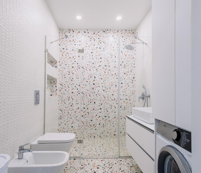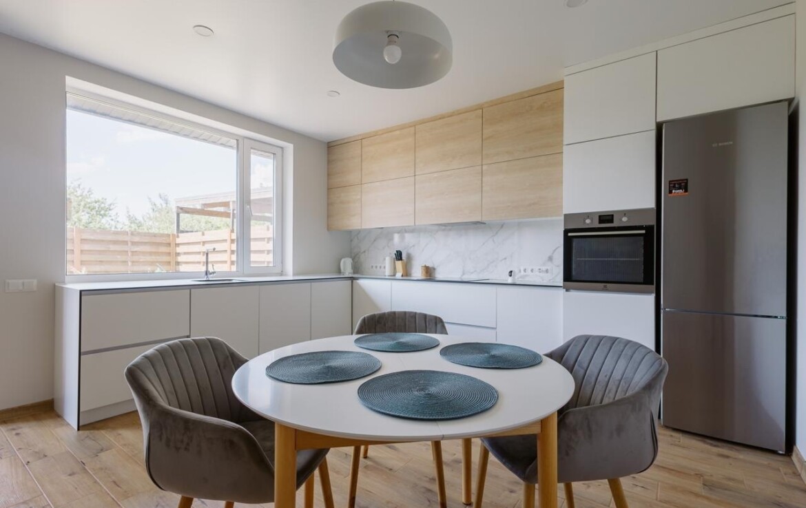 Простора світла кухня-вітальня для сімейних вечорів. Сучасний санвузол.